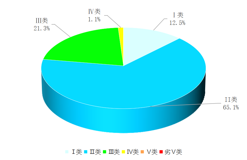 2025年1-2月,全省主要流域总体水质为优,国控断面Ⅰ~Ⅲ类水质比例99.0%,Ⅰ~Ⅱ类水质比例76.2%;国控及省控断面Ⅰ~Ⅲ类水质比例98.9%,其中Ⅰ~Ⅱ类水质比例77.6%,各类水质比例如下:Ⅰ类占12.5%,Ⅱ类占65.1%,Ⅲ类占21.3%,Ⅳ类占1.1%,无Ⅴ类和劣Ⅴ类水。