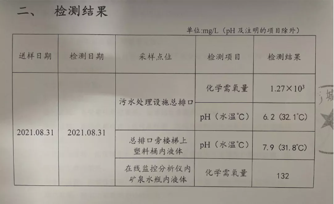 外排废水及矿泉水瓶内水样监测数据