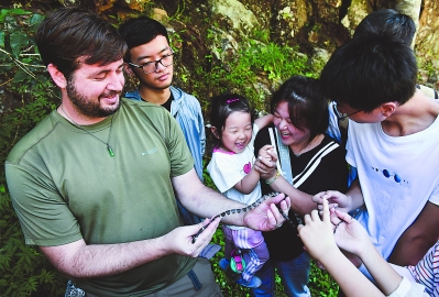 凯文主动热情地向公众普及蛇类知识。