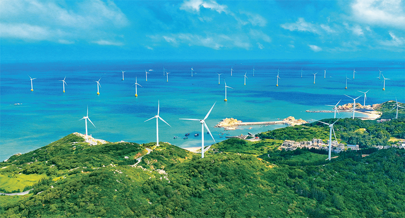 牢记“让绿水青山永远成为福建的骄傲”嘱托,福建着力打造绿色低碳产业和供应链,已经形成了包括风机、电机、叶片、钢结构件等完整风电产业链,生产的风电产品广泛应用于我国的海上风力发电。图为2024年7月13日拍摄的福建省平潭综合实验区北部生态廊道,一座座巨大的白色风机拔地而起。 福建日报社供图 江信恒/摄