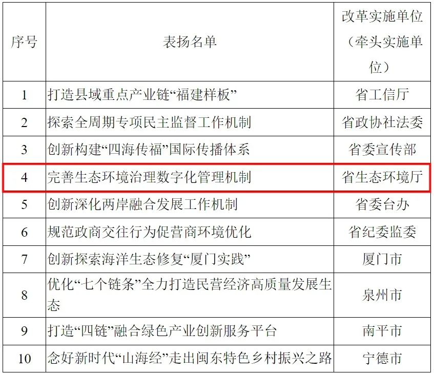 其中,福建省生态环境厅“完善生态环境治理数字化管理机制”荣获“综合示范改革”类表扬案例。