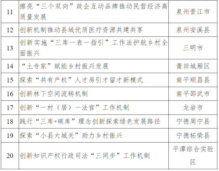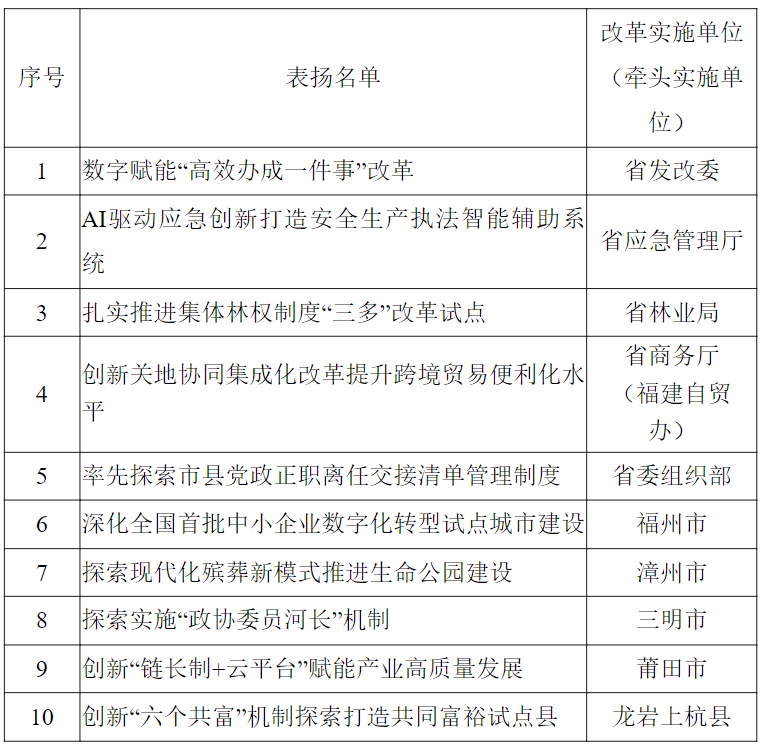 2024年福建省改革优秀案例评选活动表扬案例名单