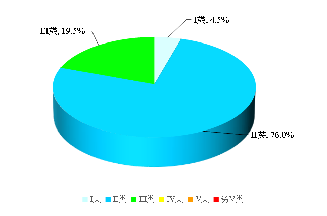 2025年1-10月,全省主要流域总体水质为优,国控断面Ⅰ~Ⅲ类水质比例100%,Ⅰ~Ⅱ类水质比例81.9%;国控及省控断面Ⅰ~Ⅲ类水质比例100%,其中Ⅰ~Ⅱ类水质比例80.5%,各类水质比例如下:Ⅰ类占4.5%,Ⅱ类占76.0%,Ⅲ类占19.5%,无Ⅳ类、Ⅴ类和劣Ⅴ类水。