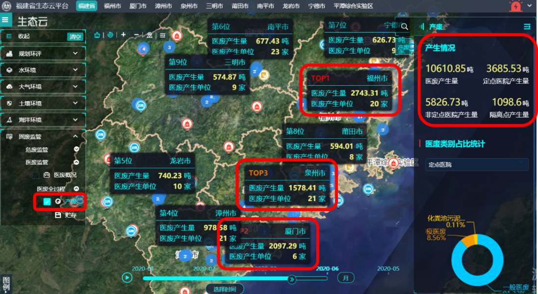 福建省生态云平台涉及13大业务板块,省固体废物环境监管平台是其中业务版块之一,可在一张图上,为危险废物和医疗废物的全过程监管的分析指挥决策提供信息化支撑。
