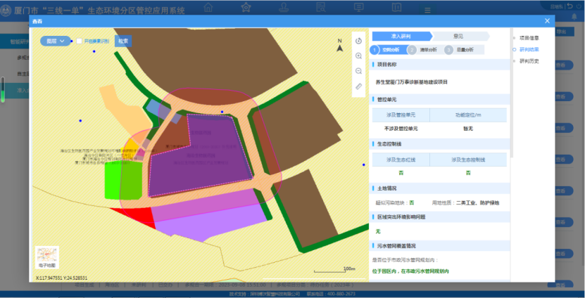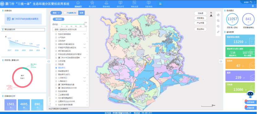 分区管控引领导航,共建共享“一张蓝图”。厦门市充分发挥应用系统与“多规合一”平台并线运行的基础优势,在生态环境分区管控一张底图上,融合国土空间、生态环保、产业布局、基础设施等239个要素图层和107713条生态环境准入条件,实现跨图层分析、多要素识别、全行业匹配,夯实生态环境分区管控智慧内核基础。