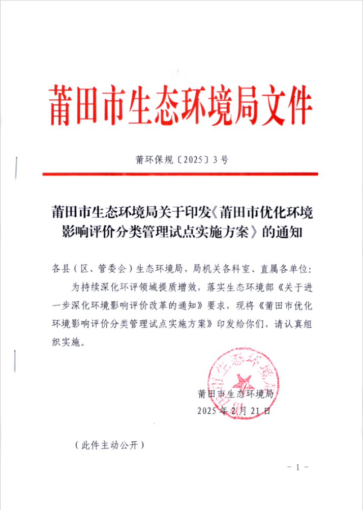 为进一步推动环评审批制度改革,积极响应生态环境部《关于进一步深化环境影响评价改革的通知》文件精神,莆田市于2025年2月21日印发实施《莆田市优化环境影响评价分类管理试点实施方案》,选取制鞋、木质家具制造、纸制品制造和印刷4个行业试点取消办理环评手续,通过制定行业准入指引、明晰办理流程、简化总量管理和强化事中事后监管等举措,探索生态环境分区管控选址环境比选、环评与排污许可制度的深度融合路径。
