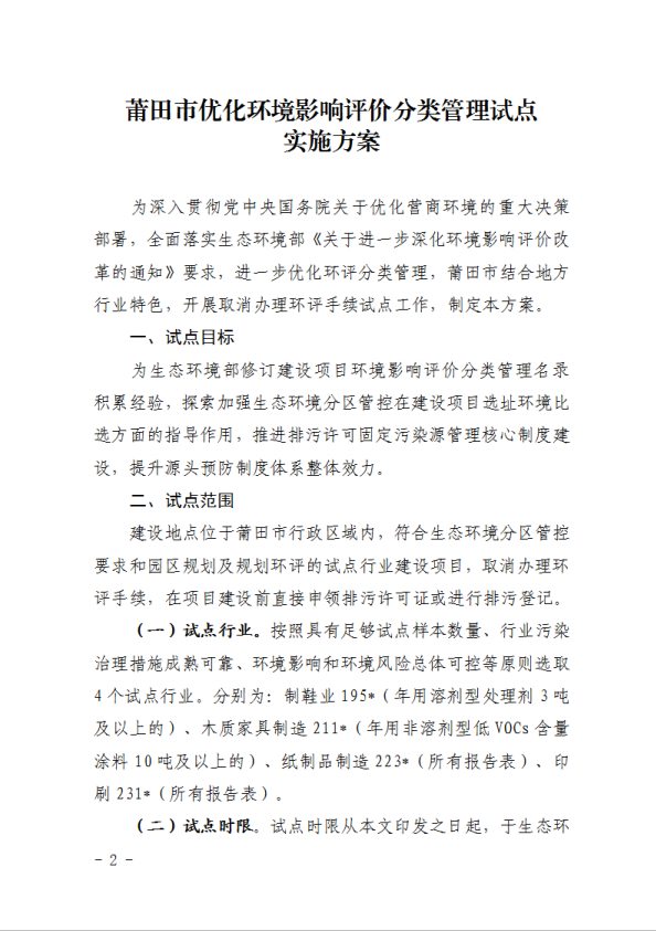莆田市优化环评分类管理试点实施文件