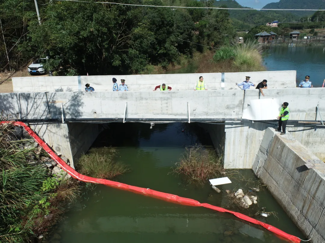 南平市松溪生态环境局“12345”热线接到模拟报警后,应急响应程序瞬间启动。由环境执法、监测、后勤保障人员与松源街道工作人员组成的联合队伍,携无人机、无人采样船、围油栏等专业装备火速赶赴现场,各小组各司其职,迅速进入“实战状态”。