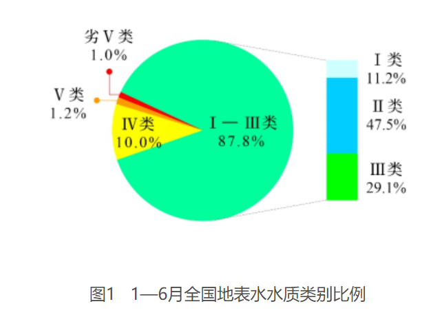 总体情况上,第二季度,3641个国家地表水考核断面中,水质优良(Ⅰ—Ⅲ类)断面比例为84.0%,同比上升1.7个百分点;劣Ⅴ类断面比例为1.1%,同比持平。主要污染指标为化学需氧量、高锰酸盐指数和总磷。1—6月,3641个国家地表水考核断面中,水质优良(Ⅰ—Ⅲ类)断面比例为87.8%,同比上升2.1个百分点;劣Ⅴ类断面比例为1.0%,同比下降0.1个百分点。主要污染指标为化学需氧量、高锰酸盐指数和总磷。