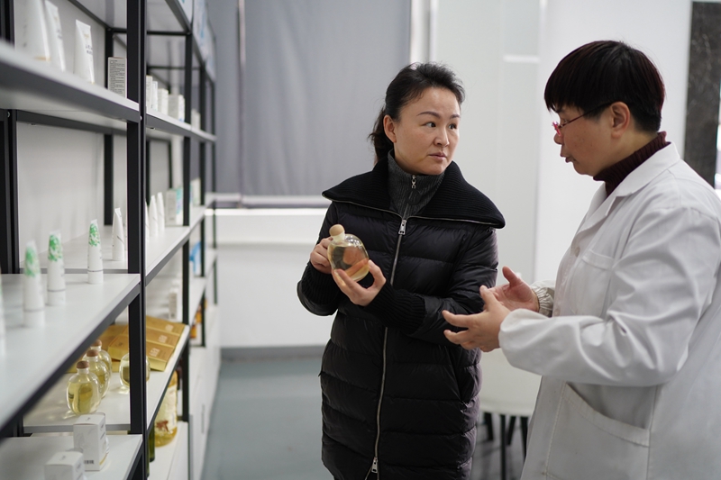 明经华(左)在位于江西赣州市章贡区的赣州哈克生物科技有限公司调研油茶深加工产业(2023年2月24日摄)。新华社记者 周密 摄
