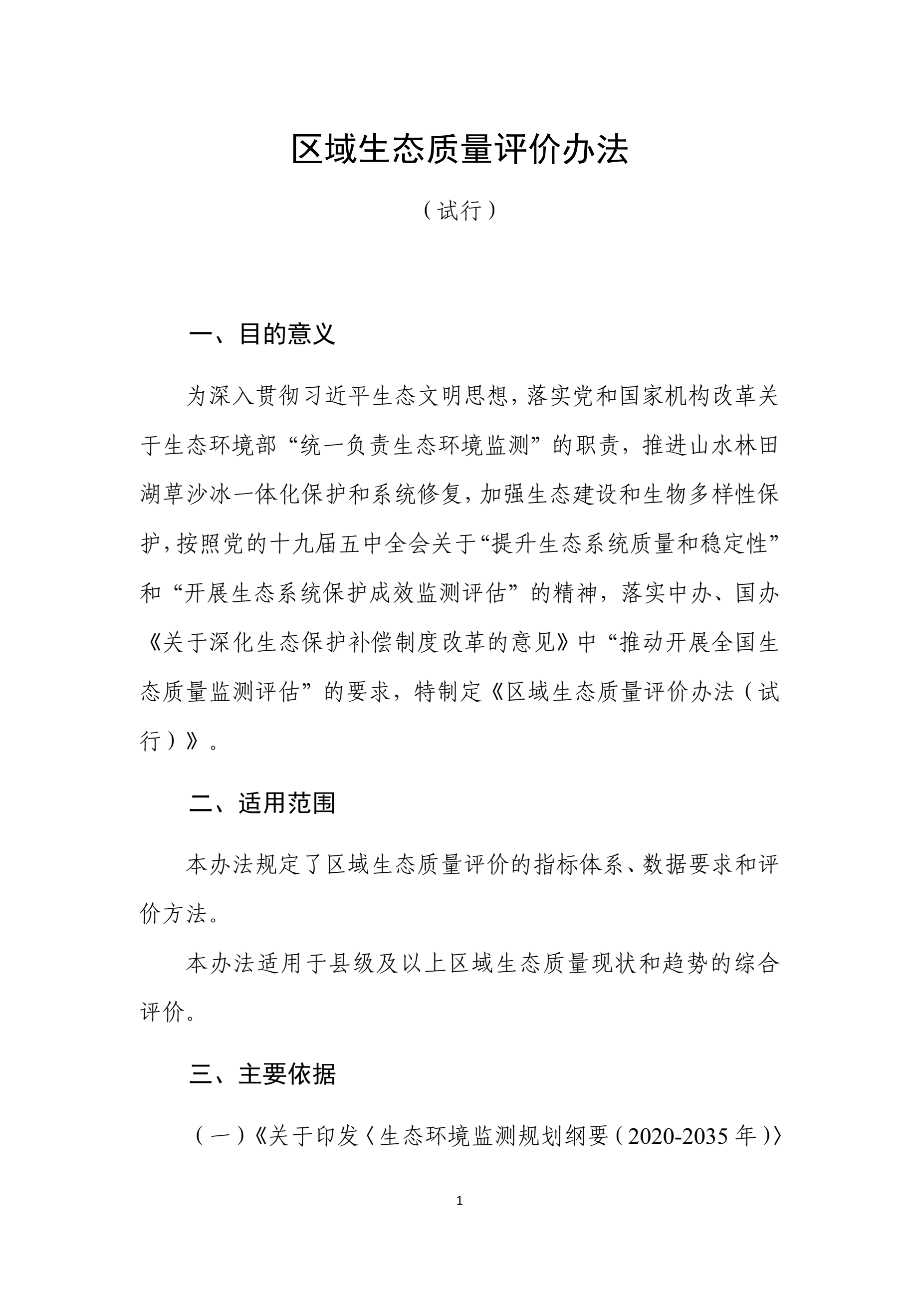 为深入贯彻习近平生态文明思想,落实党和国家机构改革关于生态环境部“统一负责生态环境监测”的职责,推进山水林田湖草沙冰一体化保护和系统修复,加强生态建设和生物多样性保护,按照党的十九届五中全会关于“提升生态系统质量和稳定性”和“开展生态系统保护成效监测评估”的精神,落实中办、国办《关于深化生态保护补偿制度改革的意见》中“推动开展全国生态质量监测评估”的要求,我部组织编制了《区域生态质量评价办法(试行)》,现印发给你们,请遵照执行。